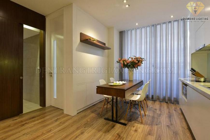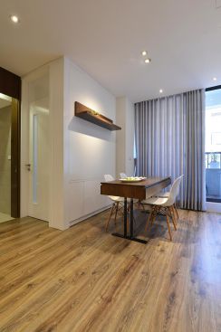 Chiếc bàn ăn đơn giản với mặt bàn có phần gấp lại có thể mở ra để nới rộng diện tích bàn khi nhà có đông người đến ăn. Trên tường phòng ăn là một chiếc kệ nhỏ để đồ. Tường căn hộ sử dụng gam màu trắng, sàn ốp gỗ tự nhiên. Từ phòng ăn đi qua một hành lang ngắn là đến cửa chính vào căn hộ. Tại đây một tấm gương dài được gắn cạnh cửa đi để mọi người có thể tiện sử dụng cũng như nới rộng diện tích không gian này. |