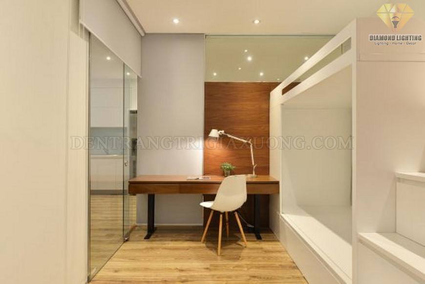 Không gian phòng ngủ được thiết kế mở với vách kính trong suốt. Từ đây có thể nhìn ra phòng ăn và bếp. Tại phòng này, ngoài chiếc giường tầng, kiến trúc sư còn bố trí một chiếc bàn làm việc xinh xắn ngay cạnh vách kính phía trước phòng. Một chiếc đèn bàn nhỏ hiện đại được đặt trên bàn làm việc.