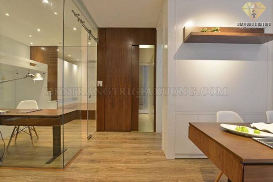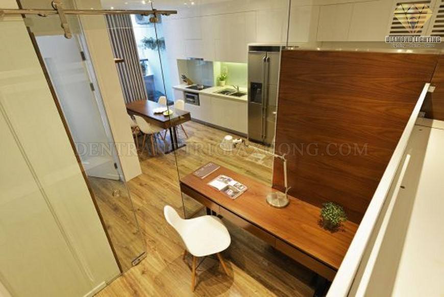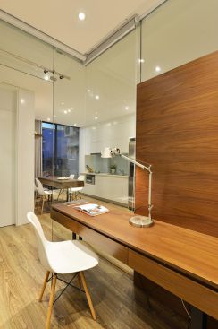 | Không gian làm việc nhỏ được thiết kế với vách kính mở rộng thông suốt ra phòng khách, khu vực ăn và bếp. |