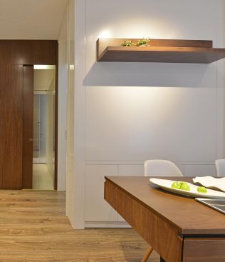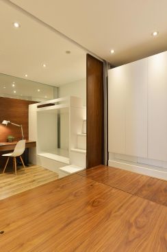 Không gian xuyên suốt của phòng khách và phòng bếp được tạo nên một phần bởi những hệ tủ liên hoàn thống nhất. Chúng một mặt kết nối không gian, một mặt là nơi chứa đồ vô cùng hữu ích trong căn hộ nhỏ. Ánh sáng tự nhiên cũng như nhân tạo được đặc biệt chú ý trong thiết kế của căn hộ. Ánh sáng được bố trí hợp lý và chọn lọc tạo hiệu ứng mở rộng cho căn hộ vốn khiêm tốn về mặt diện tích này. Rèm để ngăn chia các không gian nhỏ, đảm bảo tính riêng tư của mỗi thành viên mà vẫn thông thoáng. Gỗ nội thất trong căn hộ có 2 tông màu chủ đạo, trắng và nâu sẫm của veneer óc chó mang đến sự đơn giản và sang trọng cần thiết cho nội thất căn hộ. Song hành những ý đồ về không gian, sự xử lý tỉ mỉ và chỉn chu các chi tiết nội thất giúp không gian được tối ưu hóa một cách triệt để. |