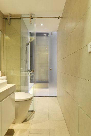 Khu vực phòng vệ sinh nhỏ xinh với đầy đủ các thiết bị sang trọng, hiện đại như tủ lavabo, xí bệt. Tấm gương khổ rộng được gắn lên tường nhằm nới rộng không gian phòng tắm nhờ hiệu ứng tạo chiều sâu của chiếc gương. Phòng tắm tuy diện tích không quá rộng nhưng vẫn rất tiện nghi với đầy đủ các thiết bị ngay cả một cabin tắm tiện nghi. Tường và sàn vệ sinh được ốp lát gạch với cùng một tông màu tạo cảm giác căn phòng như rộng hơn diện tích thực. |